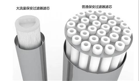 大流量保安過濾器強度大,耐高溫,對濾芯起到保護作用,折疊式表面設計使得大通量濾芯的壓力降比其它濾芯更低,使用壽命更長,在更換過程中更加的方便快捷,潔凈度更高。