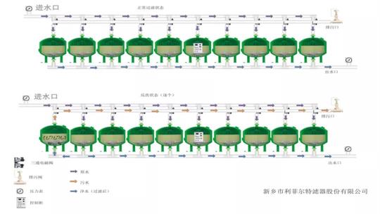 反洗狀態(tài):隨著雜質(zhì)在填料層中不斷聚積 , 內(nèi)部壓頭損失將不斷增大。當(dāng)進(jìn)、出水壓頭損失達(dá)到設(shè)定值或達(dá)到設(shè)定時(shí)間時(shí) , 系統(tǒng)將自動(dòng)激活定壓差裝置使其轉(zhuǎn)換至反洗狀態(tài) , 當(dāng)此臺(tái)反洗結(jié)束,水力閥改變給水方向從而實(shí)現(xiàn)逐臺(tái)反洗 , 更便于清洗聚積起來(lái)的雜質(zhì)。