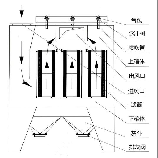 濾筒除塵器是指以濾筒作為過(guò)濾元件所組成的除塵器,其結(jié)構(gòu)是由進(jìn)出風(fēng)口、上箱體、灰斗、清灰裝置、氣流分布板、濾筒及脈沖控制裝置組成,附加設(shè)備有卸料閥、軟連接及移動(dòng)式接灰小車(chē)。